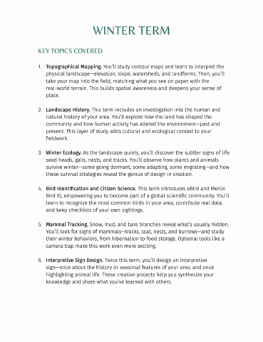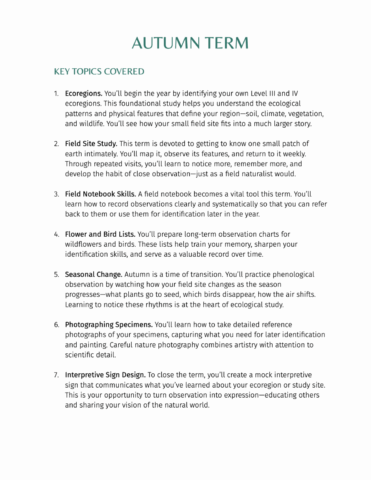 - Weekly, seasonal nature lessons (Autumn, Winter, Spring)