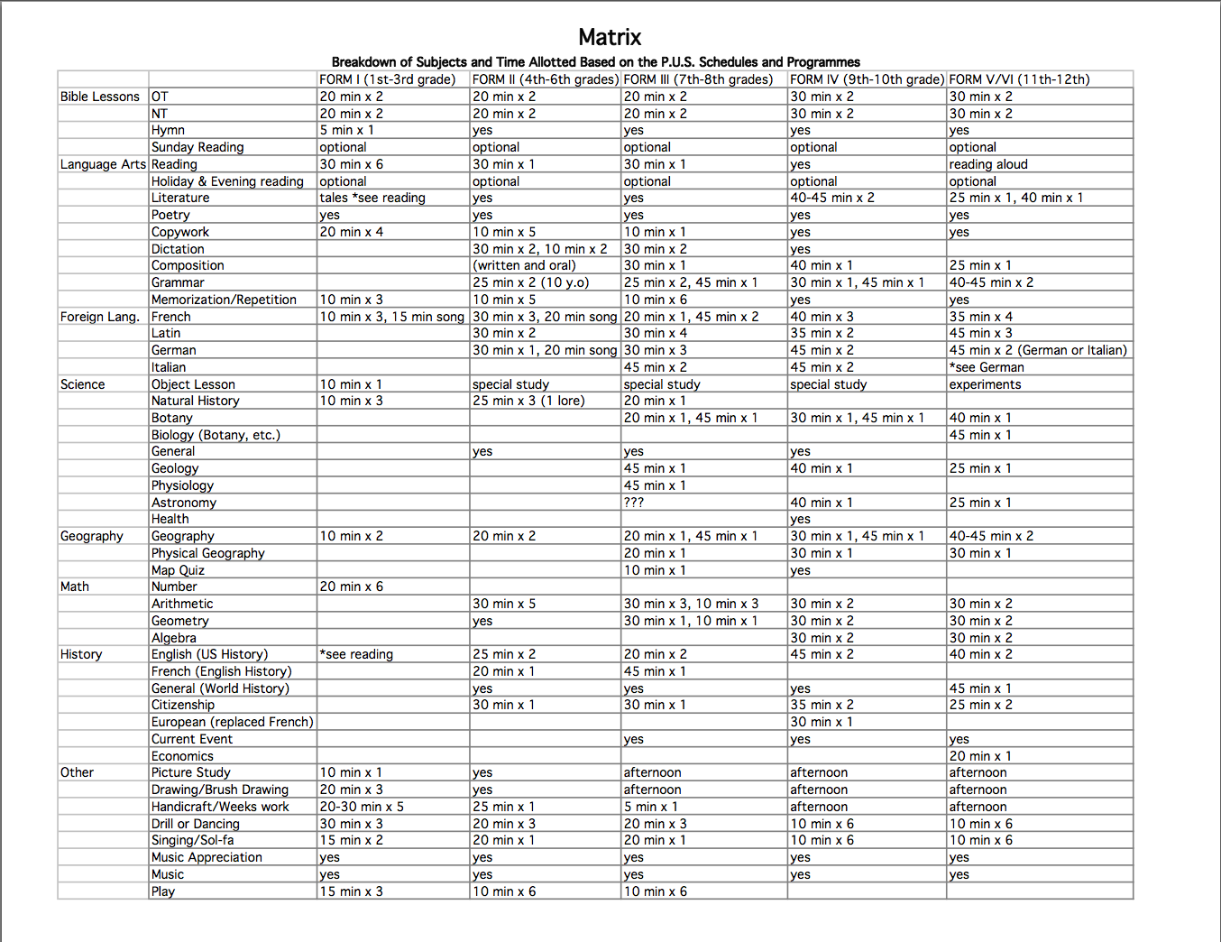 After years of studying the programmes and time-tables myself, I created a matrix of subjects based on the PUS Time-tables and Programmes. I needed a more orderly look at what the students were doing, and found that by re-ordering the schedules I was able to see so much more. Such as what the forms have in common, and how a subject changed over the years. (More time or less, more individual subjects or less.) Print here